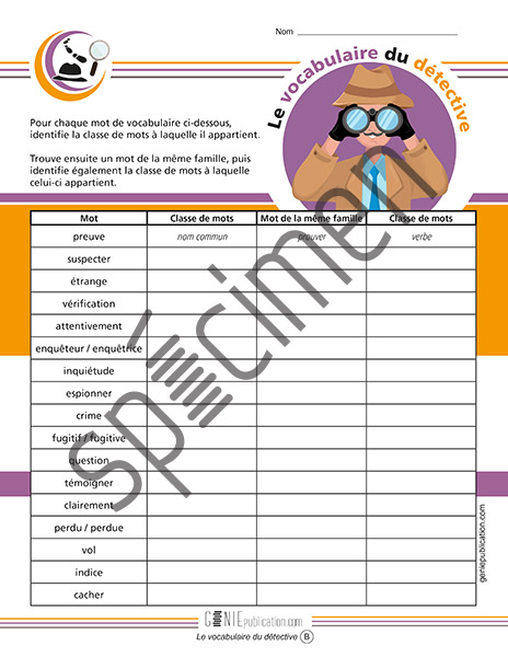 L’élève doit classer les mots de vocabulaire par classe de mot et trouver un mot de la même famille.