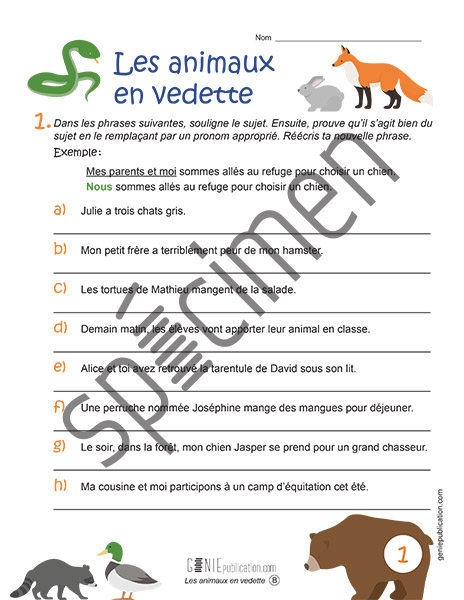 L’élève doit identifier le groupe sujet de chaque phrase, puis le remplacer par le pronom personnel approprié. L’élève doit ensuite écrire cinq phrases en remplaçant leur groupe sujet par un pronom.