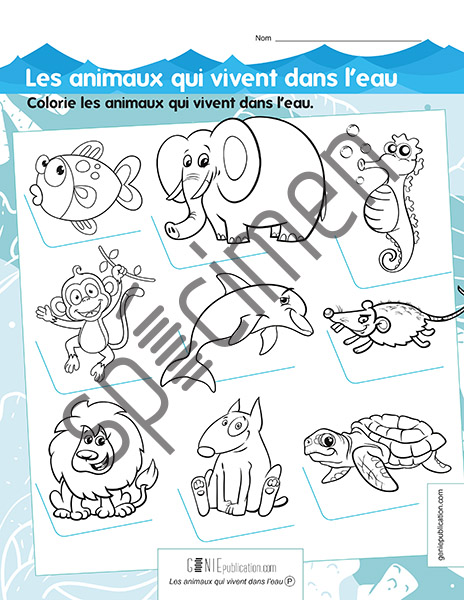 L'élève doit colorier les animaux qui vivent dans l'eau.
