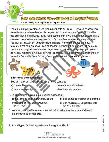 L’élève lit un texte sur les animaux terrestres et aquatiques et répond à des questions.