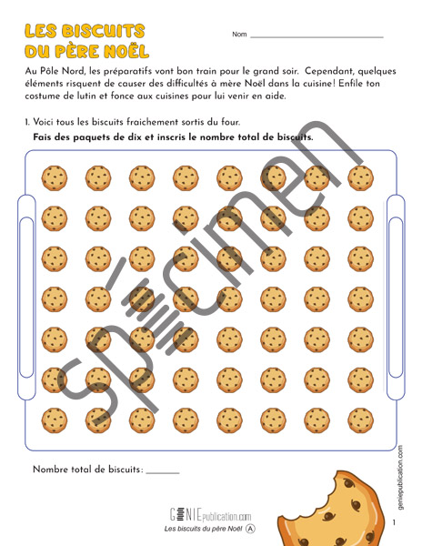L’élève doit faire des ensembles de biscuits, mettre des fournées en ordre décroissant et trouver le nombre de biscuits qui ont été mangés en cachette.