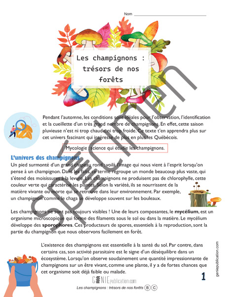 Ce texte explique ce que sont les champignons, comment se fait la cueillette et l’importance d’être accompagné d’une personne expérimentée pour identifier correctement les variétés. À la suite de sa lecture, l’élève est invité à répondre à des questions pour vérifier sa compréhension.