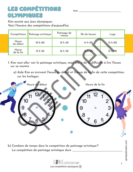 L’élève indique l’heure des compétitions sur des horloges et détermine la durée des compétitions.