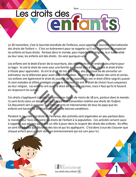 L'élève lit le texte sur les droits des enfants. Il doit ensuite répondre aux questions et réfléchir aux droits des enfants et à leur respect dans le monde.