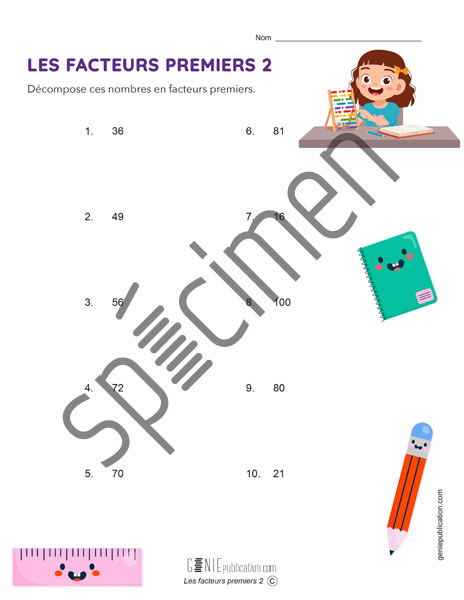 L’élève doit décomposer différents nombres en produit de facteurs premiers.
