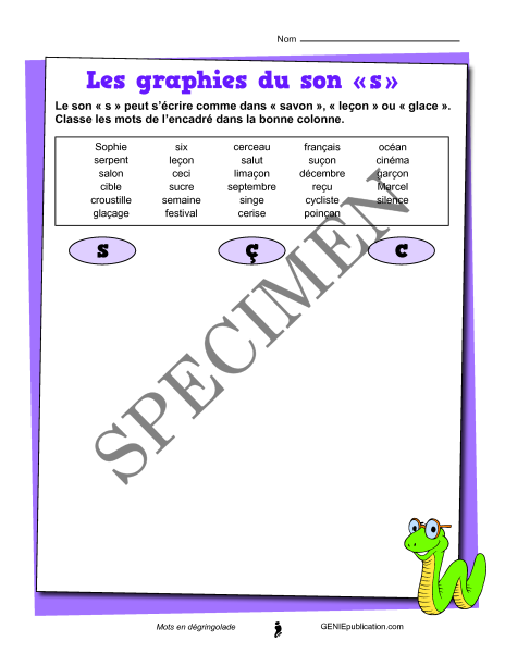 Dans cet exercice, les élèves de la première année doivent classer des mots contenant le son «s» selon leur graphie : «s», «ç» ou «c»