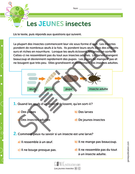 L’élève lit un texte sur la croissance des insectes et répond à des questions.