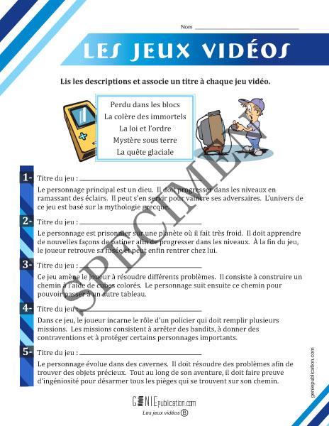 L'élève doit associer le titre le plus approprié à chacun des jeux vidéos décrits dans cette activité.