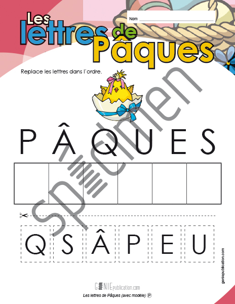 L'élève doit replacer les lettres du mot Pâques dans l'ordre à l'aide du modèle.