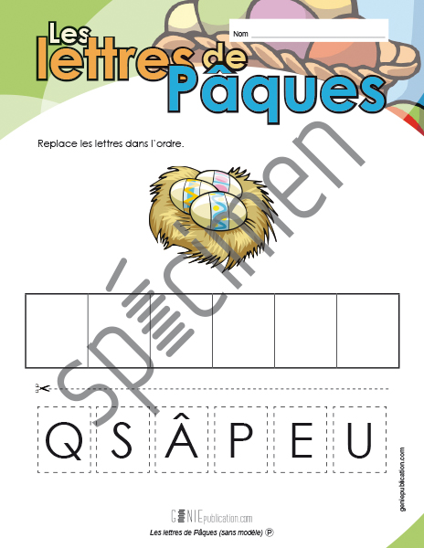 L'élève doit replacer les lettres du mot Pâques dans l'ordre sans utiliser de modèle.