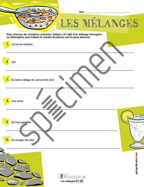 L'élève doit indiquer si les mélanges présentés sont des mélanges homogènes ou hétérogènes, puis doit indiquer le nombre de phases visibles dans chacun.