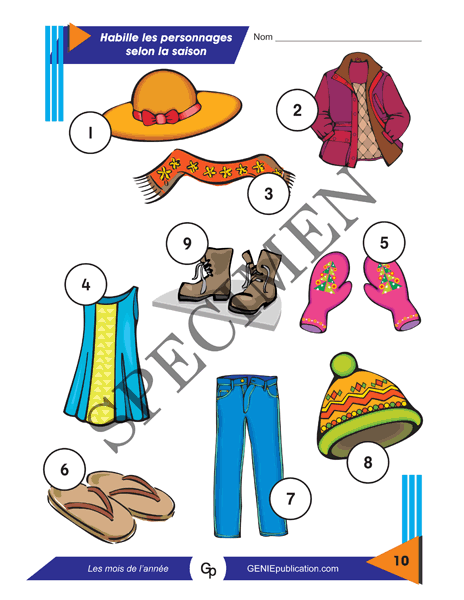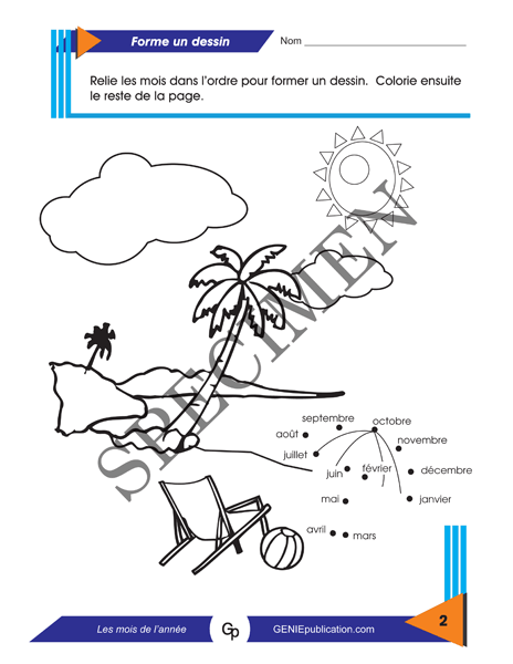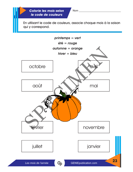 Le document Les mois de l’année s’adresse aux élèves du préscolaire et de la 1re année du primaire. Il est constitué d’activités variées regroupées sous le thème des mois de l’année et des saisons. Trois catégories départagent ce document : les exercices de lettres, les exercices de logique et les exercices de coloriage.