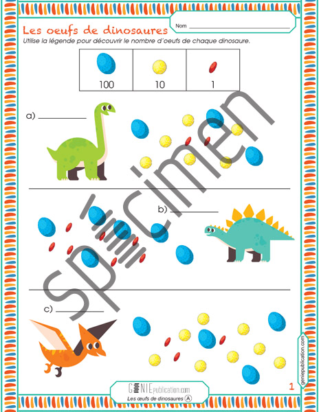 L’élève doit calculer la valeur de chaque ensemble d’œufs de dinosaures.