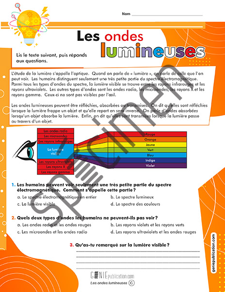 L’élève doit lire un texte sur les ondes lumineuses et répondre à des questions