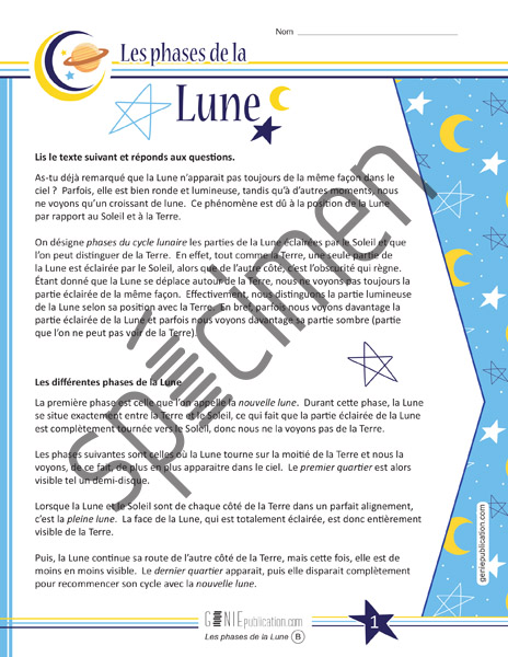 Activité dans laquelle l'élève doit lire un texte sur les phases du cycle lunaire et répondre à des questions.