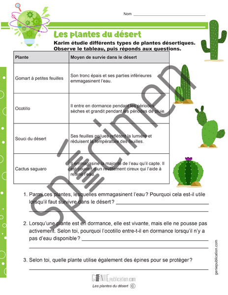 L’élève observe un tableau sur les plantes qui vivent dans le désert et répond à des questions.