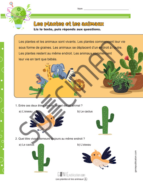 L’élève lit un texte sur les plantes et les animaux et répond à des questions.