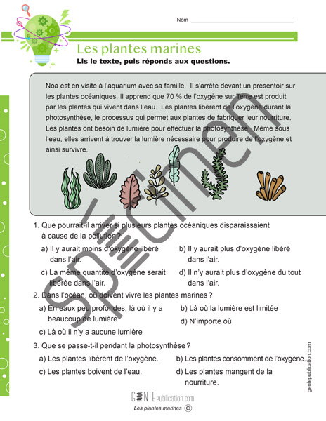 L’élève lit un texte sur les plantes marines et la photosynthèse puis répond à des questions.