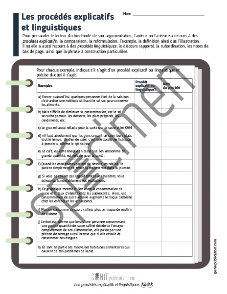 Activité dans laquelle l'élève doit identifier les procédés explicatifs et linguistiques utilisés.