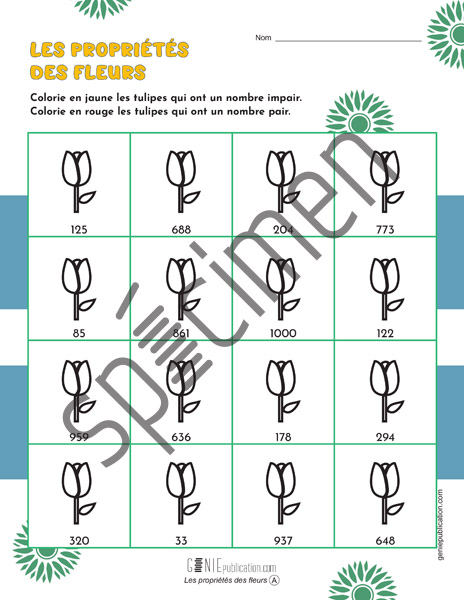 L’élève doit colorier les fleurs de la bonne couleur en déterminant si elles possèdent un nombre pair ou un nombre impair.