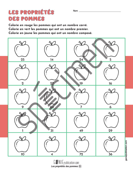 L’élève doit colorier les pommes de la bonne couleur en déterminant si elles possèdent un nombre premier, un nombre carré ou un nombre composé.