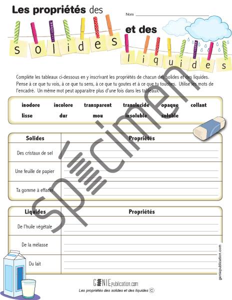 L'élève doit compléter des tableaux en y indiquant les propriétés des solides et des liquides donnés.