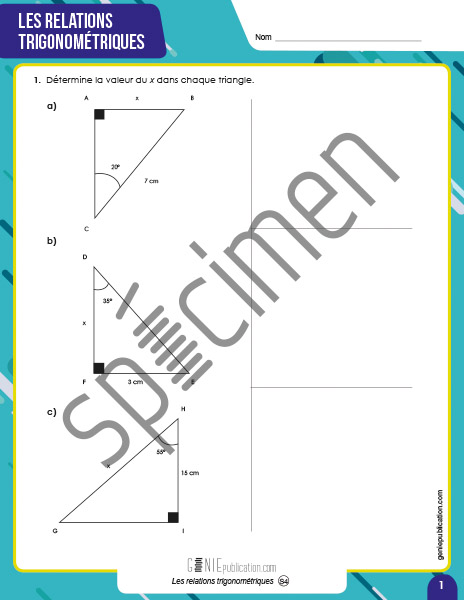 L'élève doit trouver des mesures manquantes en utilisant les relations trigonométriques.