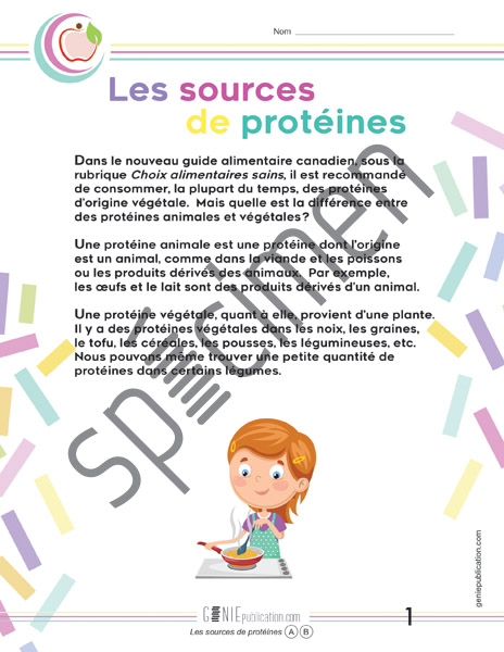 Activité dans laquelle l'élève doit lire un texte sur les protéines végétales et les protéines animales, et classer les aliments.