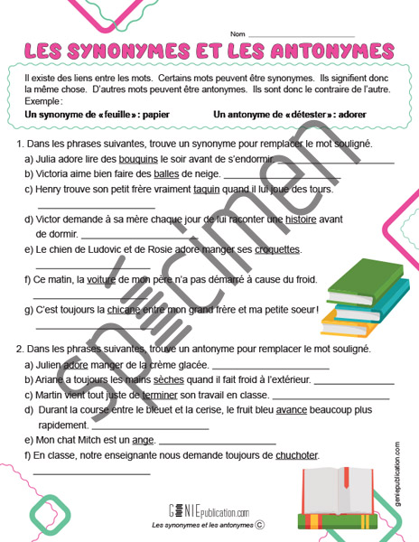 L’élève doit lire les phrases et trouver un synonyme ou un antonyme du mot souligné, selon le cas.