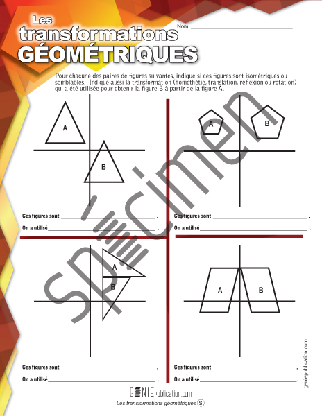 L'élève doit indiquer si des figures sont isométriques ou semblables et identifier la transformation géométrique qui a dû être utilisée afin d'obtenir la seconde figure à partir de la première.