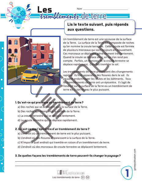 L’élève lit un texte sur les tremblements de terre, observe l’échelle de Richter et répond à des questions.