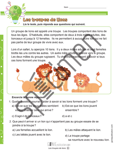 L’élève lit un texte sur les troupes de lions et répond à des questions.