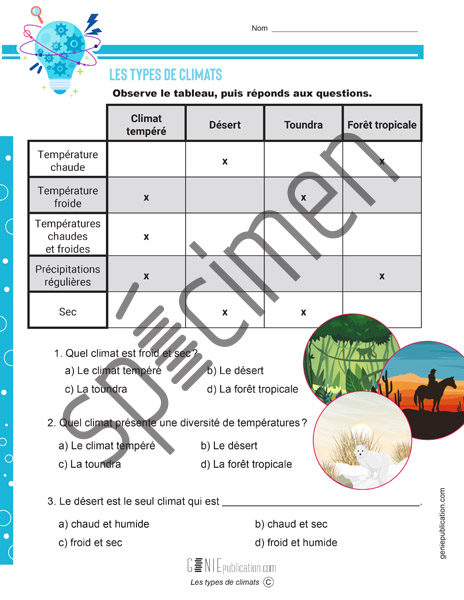 L’élève observe un tableau sur les différents types de climats et répond à des questions.