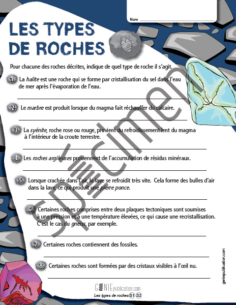 L'élève doit donner le type de roche de chacune des roches énoncées.