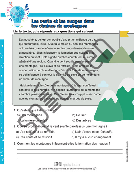 L’élève lit un texte sur l’influence des montagnes et des vents sur le climat et répond à des questions.