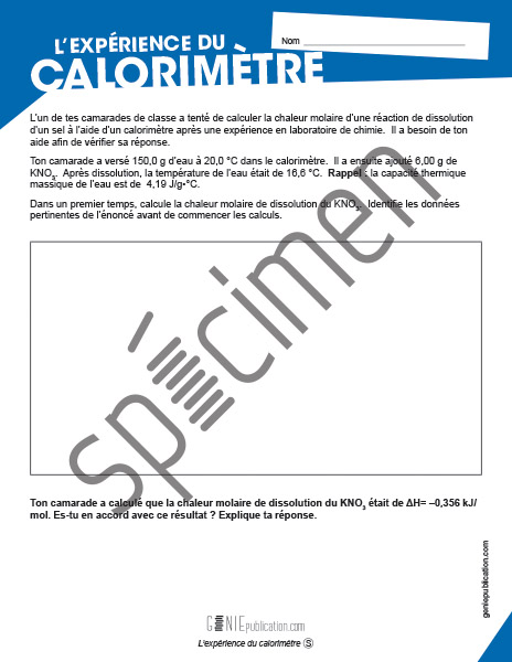 L'élève doit calculer la chaleur molaire de dissolution de l'expérience énoncée dans l'activité. Il doit ensuite calider la réponse d'un camarade fictif et justifier la réponse qu'il a obtenue.
