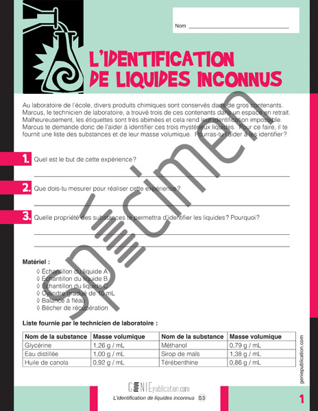 L'élève réalise une expérience qui a pour but d'identifier 3 liquides inconnus à l'aide de la masse volumique.