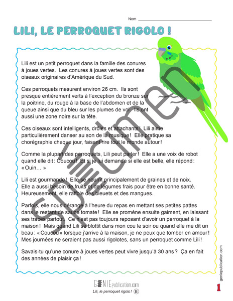 Découvre un petit perroquet attachant qui fait vivre toutes sortes d’émotions à sa propriétaire. Elle parle, danse et fait même parfois quelques bêtises. Un texte attachant et coloré au sujet des conures à joues vertes, un petit perroquet d’Amérique du Sud.