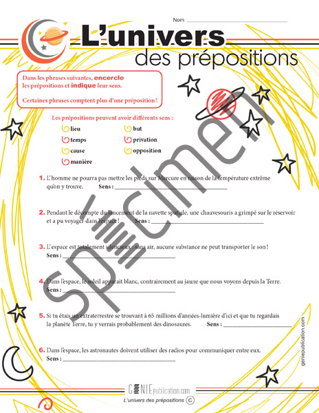 Exercice dans lequel l'élève doit identifier les prépositions et indiquer leur sens.