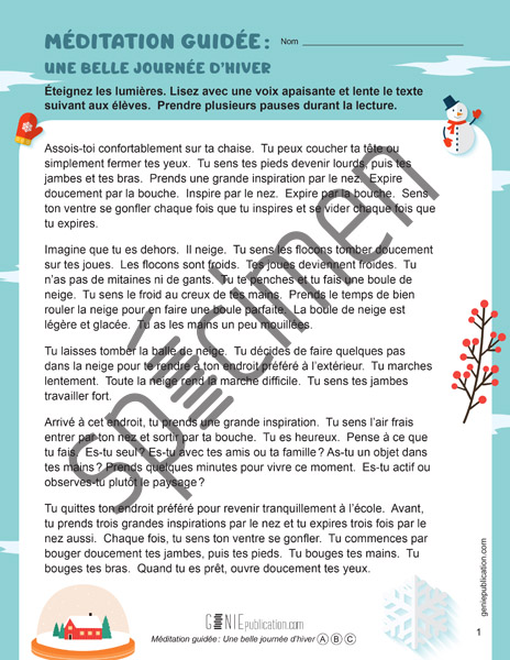 L’enseignante ou l’enseignant guide une courte séance de méditation en classe. Les élèves doivent ensuite revenir sur leur expérience en répondant à des questions.