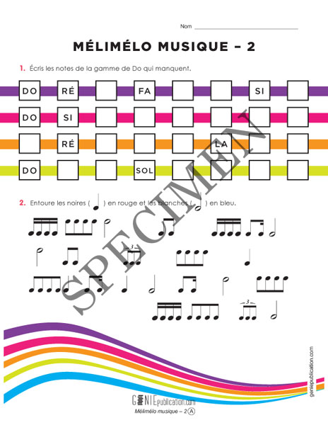 L'élève doit d'abord compléter des gammes en écrivant le nom de chaque note, puis reconnaitre et identifier les blanches et les noires parmi d'autres figures rythmiques.