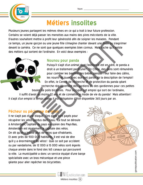 L'élève lit un texte sur des métiers insolites et répond à des questions de compréhension.
