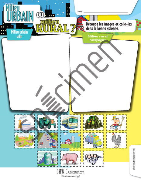 L'élève doit classer des illustrations dans la bonne colonne selon qu'elles s'apparentent davantage à un milieu de vie urbain ou à un milieu de vie rural.