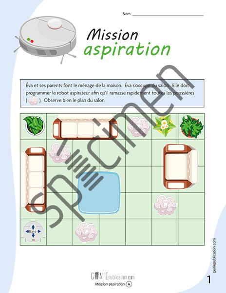 L’élève doit déterminer le chemin que devra prendre un robot aspirateur pour ramasser toutes les poussières du salon. À l’aide d’un plan quadrillé simple, l’élève programme une série de mouvements en indiquant chaque déplacement par une flèche.