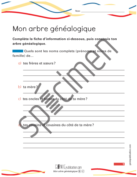 Après avoir rempli une fiche questionnaire au sujet des différents membres de sa famille, l'élève doit construire son arbre généalogique.