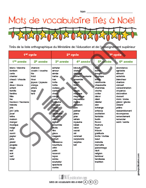 Ce document est une liste des mots de vocabulaire lié à Noël pour chaque année du primaire. Il est tiré de la liste orthographique du Ministère de l'éducation et de l'enseignement supérieur.