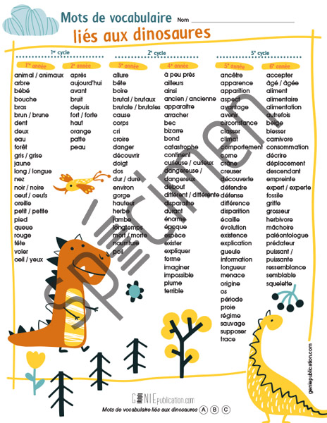 Ce document est une liste de mots de vocabulaire liés aux dinosaures et peut être utilisé pour chaque année du primaire. Il est inspiré de la liste orthographique du ministère de l'Éducation et de l'Enseignement supérieur.