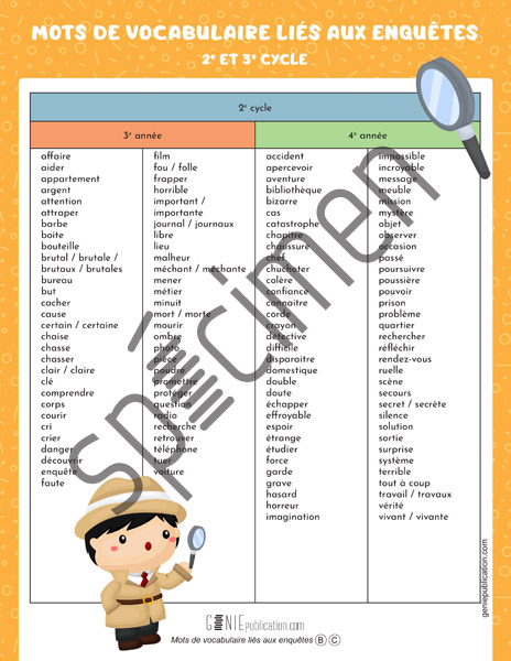 Ce document est une liste des mots de vocabulaire liés aux enquêtes pour le 2e et le 3e cycle. Tous les mots proviennent de la liste orthographique du ministère de l'Éducation et de l'Enseignement supérieur.