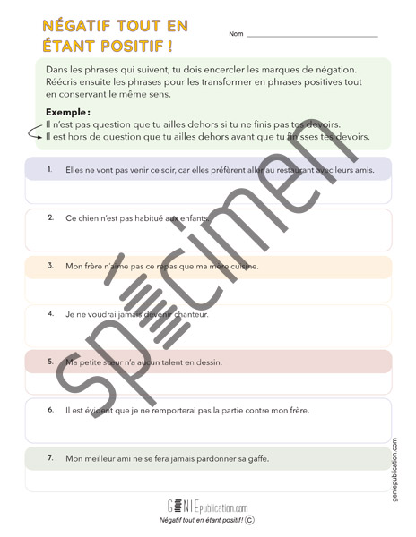 L’élève doit transformer les phrases négatives en phrases positives en s’assurant qu’elles conservent le même sens.