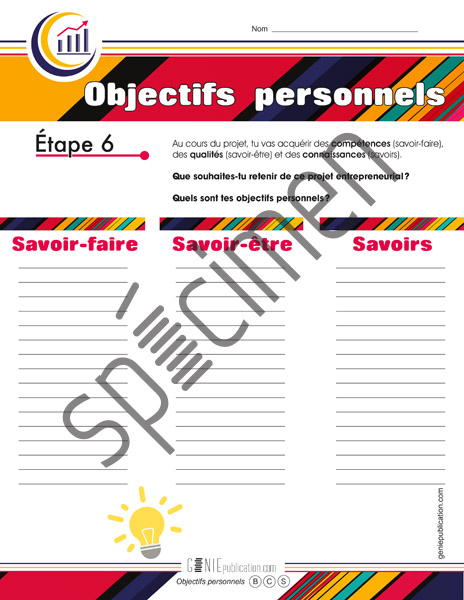 Sixième étape dans l'élaboration d'un projet entrepreneurial en classe ou en groupe pour une entreprise scolaire : mes objectifs personnels.